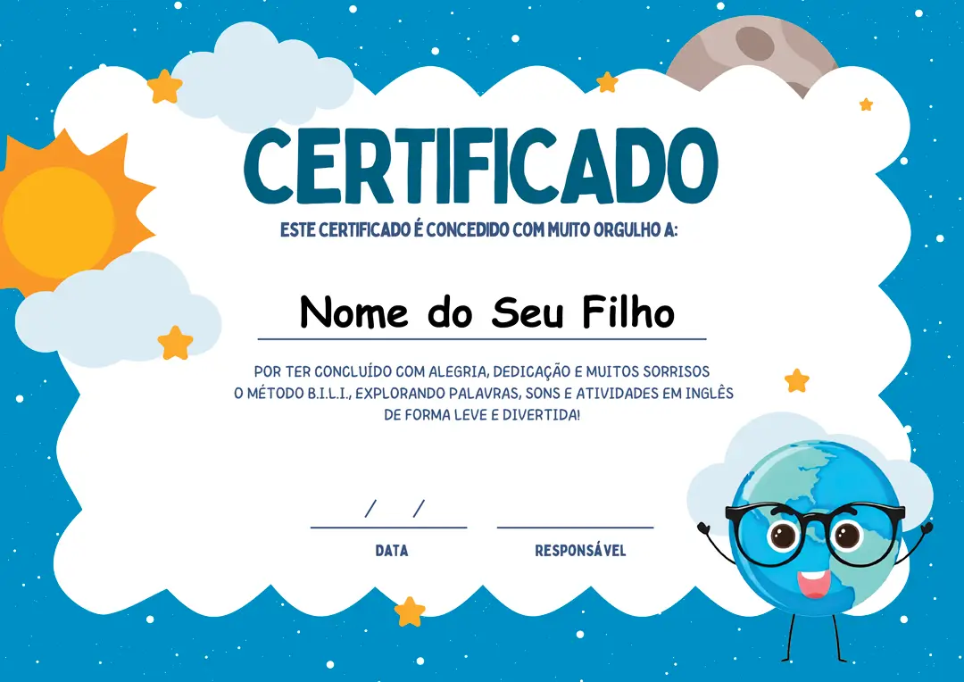 Cada atividade do Método B.I.L.I. foi criada para despertar o interesse da criança pelo inglês, estimular o raciocínio com jogos interativos e desenvolver as bases da compreensão auditiva e vocalização do idioma. Tudo apresentado de forma leve, divertida e acessível — como uma brincadeira, mas com resultado de verdade.