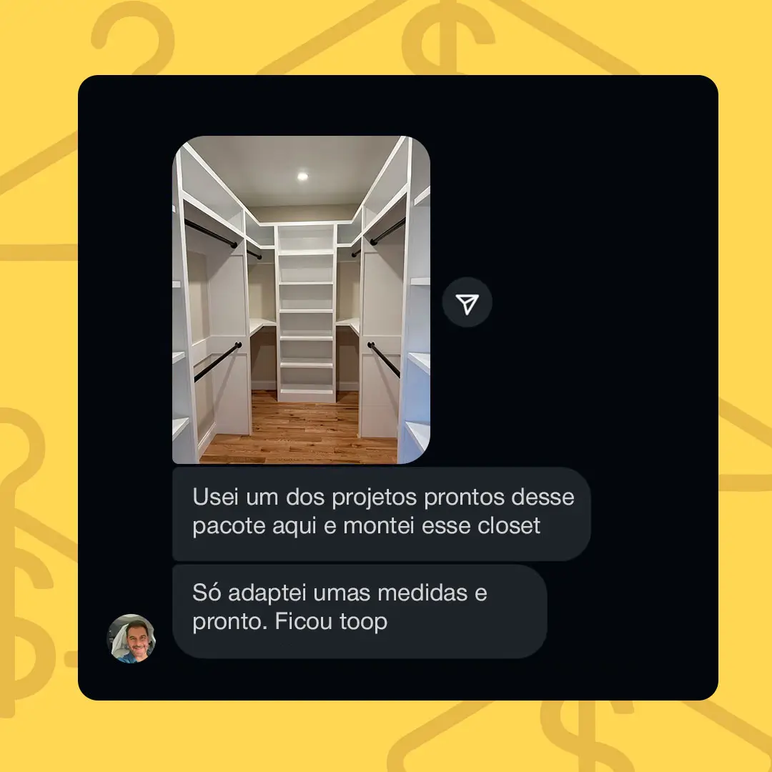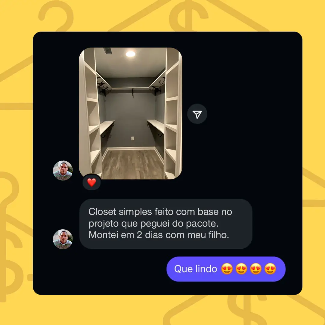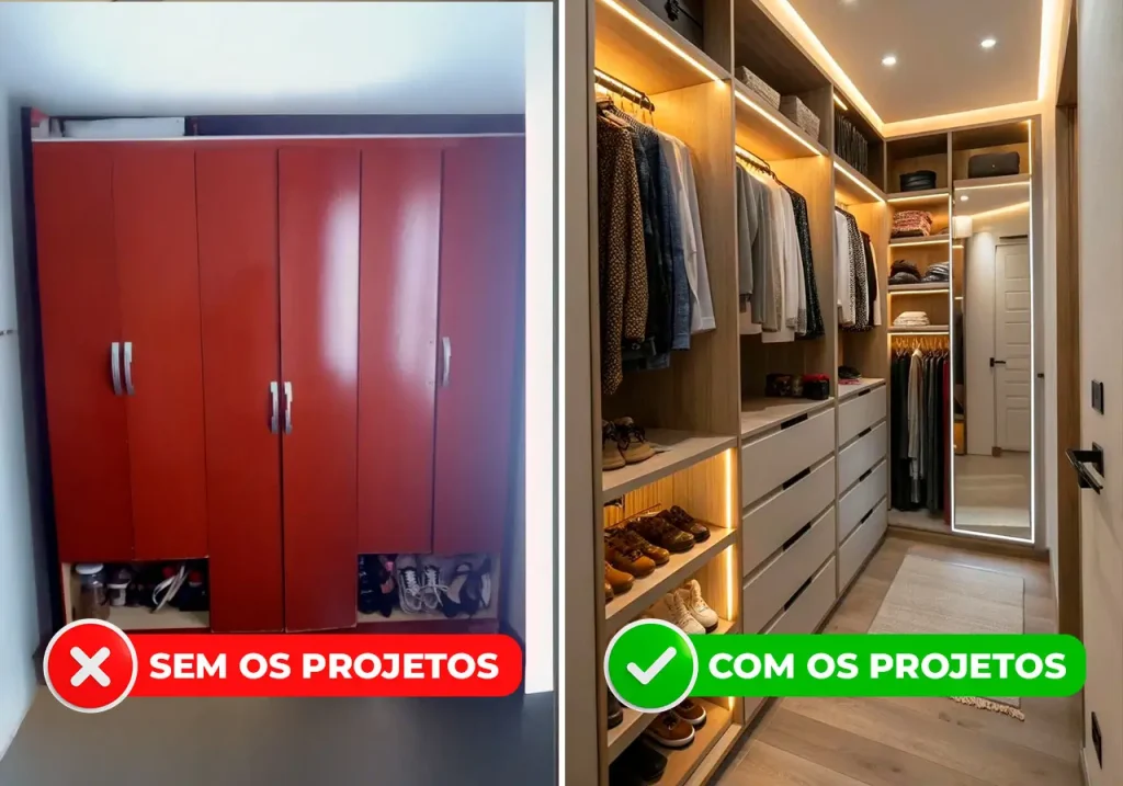Tenha acesso imediato a projetos de closets prontos, atualizdos, modernos e profissionais, para você copiar, produzir e vender sem perder tempo criando do zero.